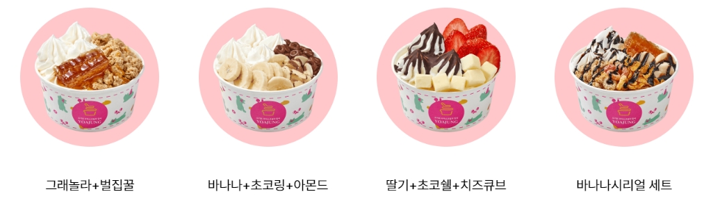 | 조합 | 요거트아이스크림 150g | 바나나 30g | 초코링 30g | 슬라이스 아몬드 30g |