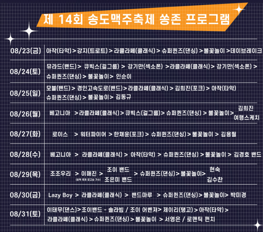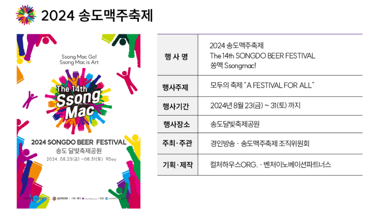 올해로 14번째를 맞는 송도맥주축제는 대한민국 대표 문화 축제 브랜드를 넘어 새로운 K-컬처의 아이콘이 되었습니다. 8월 31일 토요일까지 다양한 음악과 시원한 맥주가 있는 송도맥주축제의 먹거리, 가수들의 공연 일정, 선착순 사전 예약 가능한 테이블존까지 한방에 정리해 드립니다.
