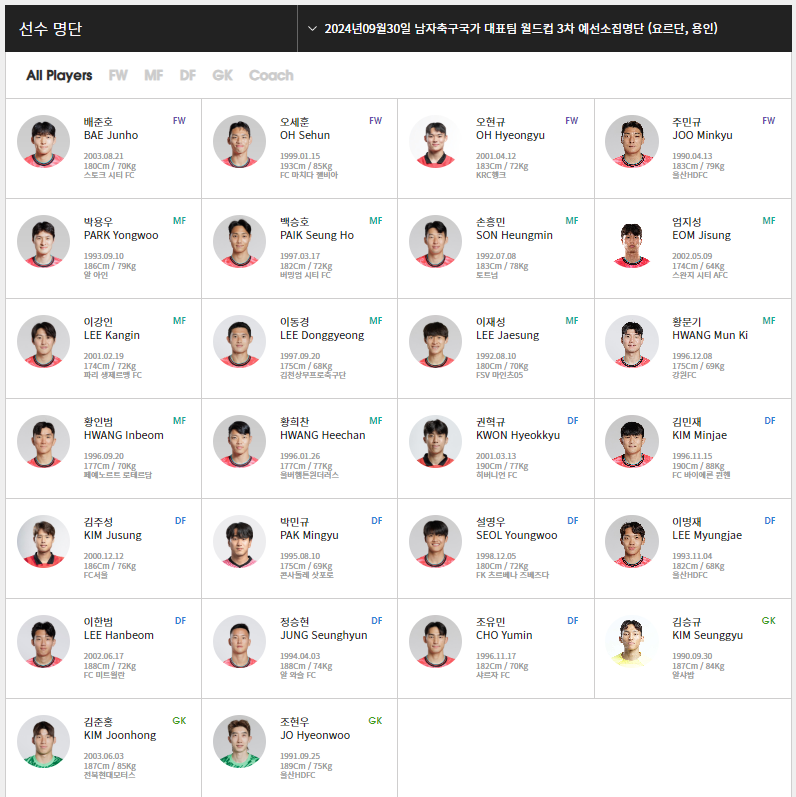 ✅ 2024년 8월 26일 발표한 축구 국가대표팀 명단은 아래와 같습니다. 설영우, 김민재, 김문환 선수 등 부상 후 복귀한 선수들이 대거 포함되어 기대가 됩니다.