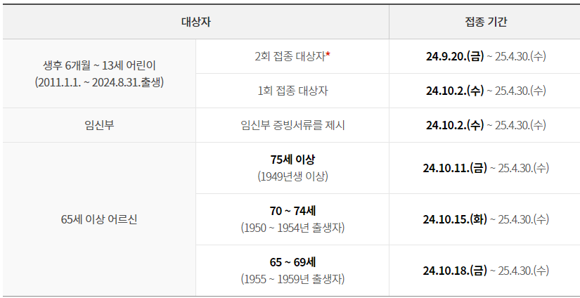 ✅ 무료 접종 대상자는 어린이, 임산부, 65세 이상 어르신으로 구분합니다.