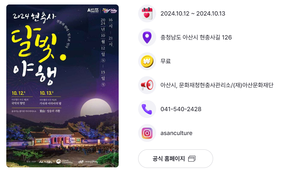 | 아산시 | 현충사 달빛야행 | 10.12.(토) ~ 10.13.(일) | 현충사 |