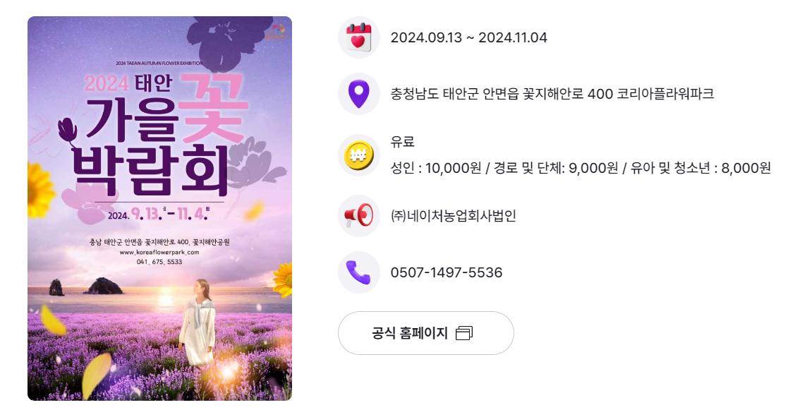 ✅ 태안 가을꽃박람회는 특정 화훼에 국한하지 않고 잔잔하면서 포근한 가을 특유의 감성을 살려 자연과 어우러지는 다양한 품종을 선보입니다. 시리도록 아름다운 꽃지 해변의 붉은 노을을 스토리 텔링하고 희망과 치유의 2024년 가을을 만끽할 수 있습니다.