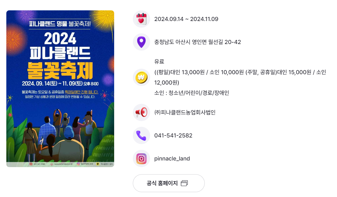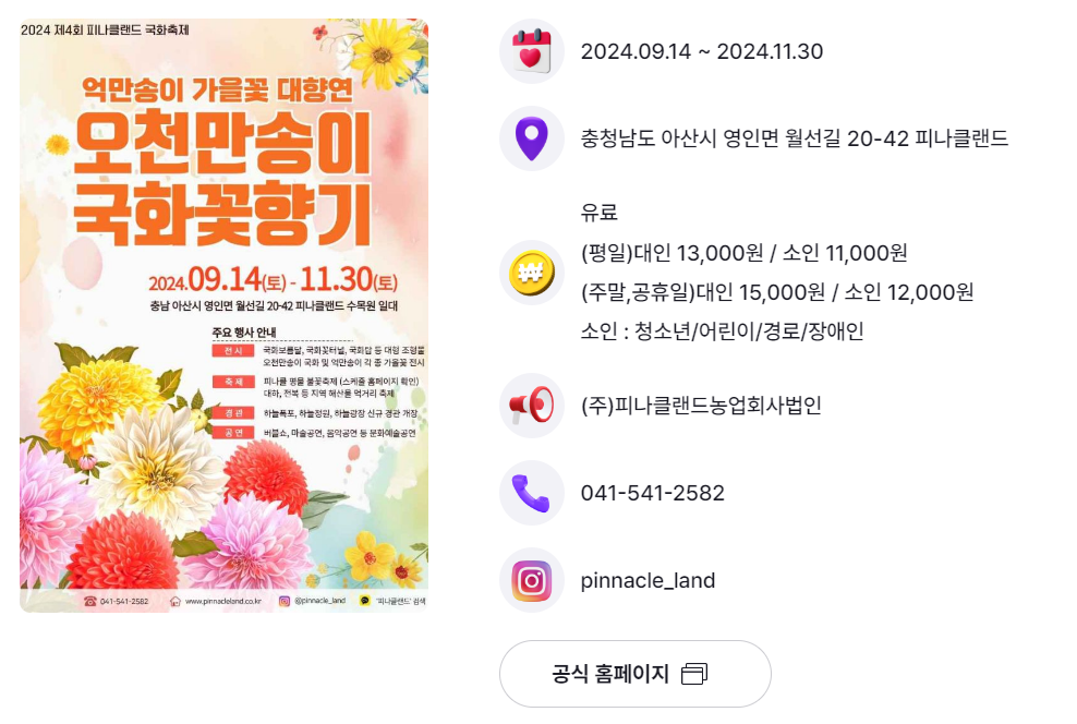 | 아산시 | 피나클랜드 오천만송이 국화축제 피나클랜드 불꽃축제 |