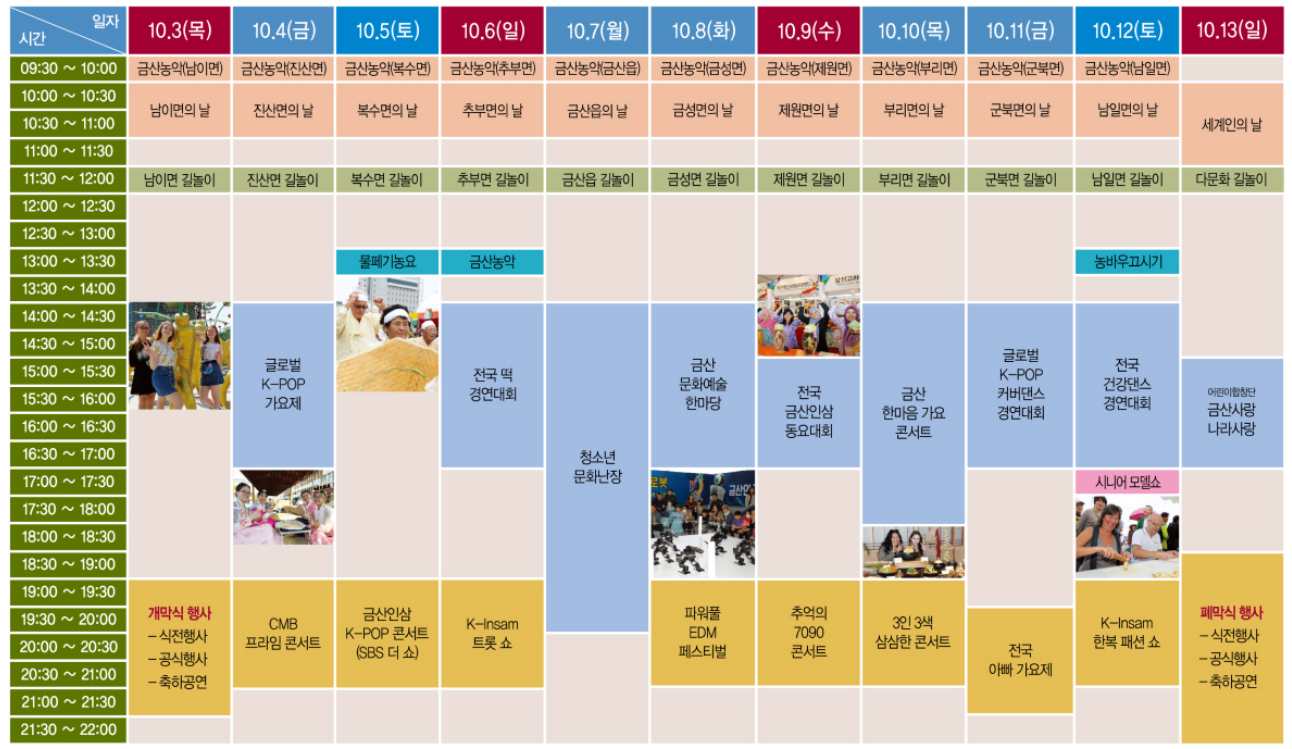 | 금산군 | 금산 세계인삼축제 | 10.3.(목) ~ 10.13.(일) | 금산인삼엑스포광장 및 인삼약초거리 일원 |
