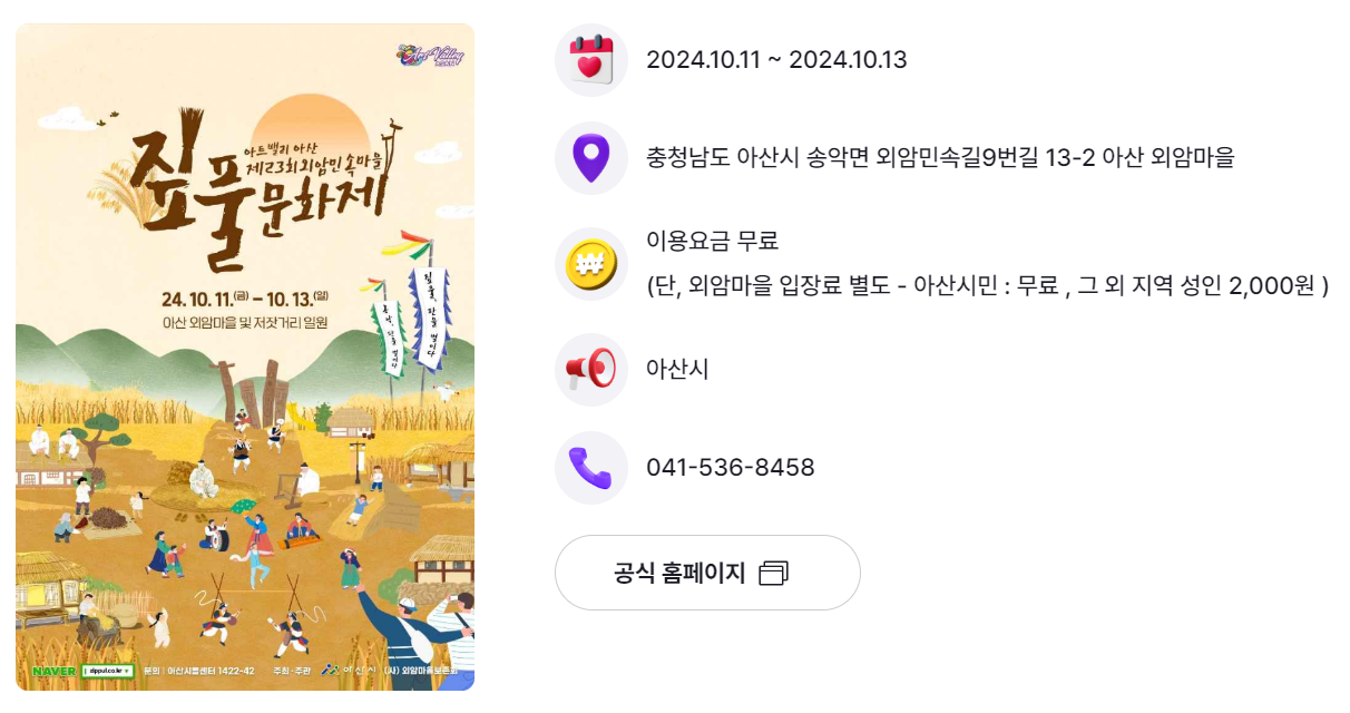 | 아산시 | 외암민속마을 짚풀문화제 | 10.11.(금) ~ 10.13.(일) | 아산 외암민속마을 |
