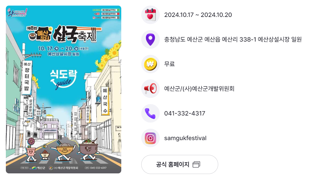 | 예산군 | 예산장터 삼국축제 | 10.17.(목) ~ 10.20.(일) | 예산상설시장 일원 |