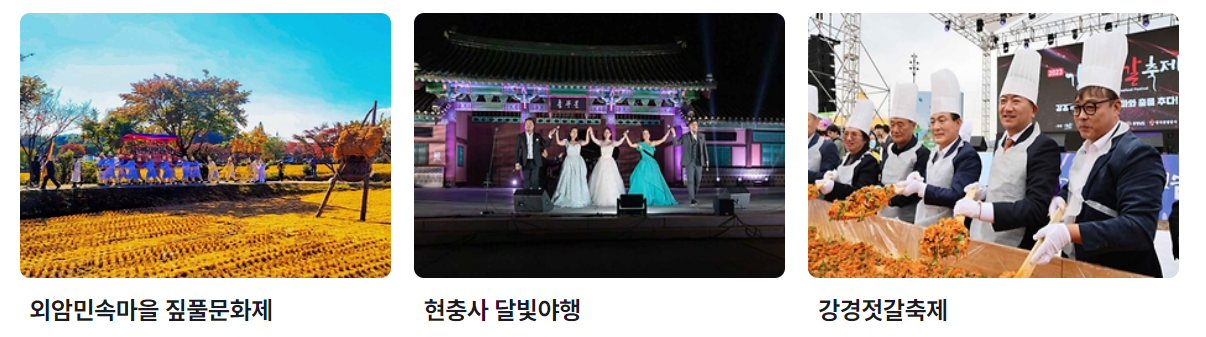 경상도 각 지자체에서 준비한 가을 축제가 매우 다채롭습니다. 맛과 멋, 열정을 담은 다양한 축제들을 모아 정리해 드립니다. 가을이 가기 전에 꼭 방문해 보세요~! 경상도 지역축제명기간장