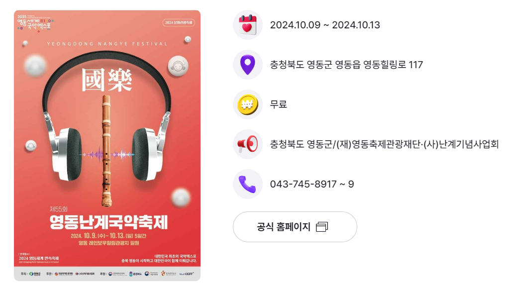 | 영동군 | 영동난계국악축제 | 10.9.(수) ~ 10.13.(일) | 레인보우힐링관광지 |
