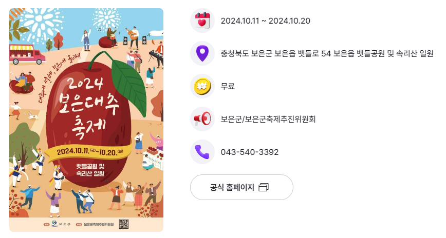 | 보은군 | 보은 대추축제 | 10.11.(금) ~ 10.20.(일) | 보은 뱃들공원 및 속리산 일원 |