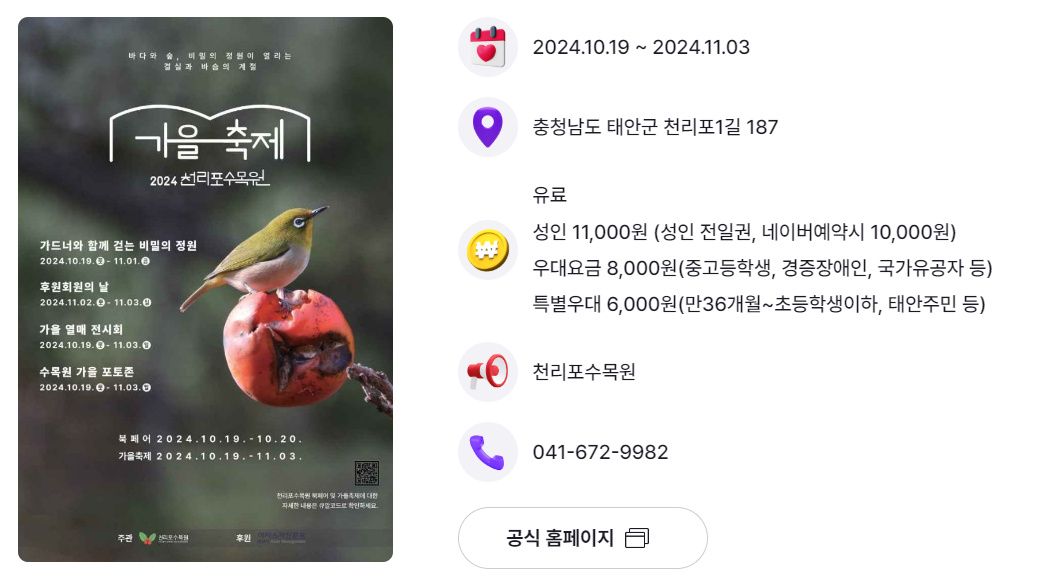 | 태안군 | 천리포수목원 가을축제 | 10.19.(토) ~ 11.3.(일) | 천리포수목원 |