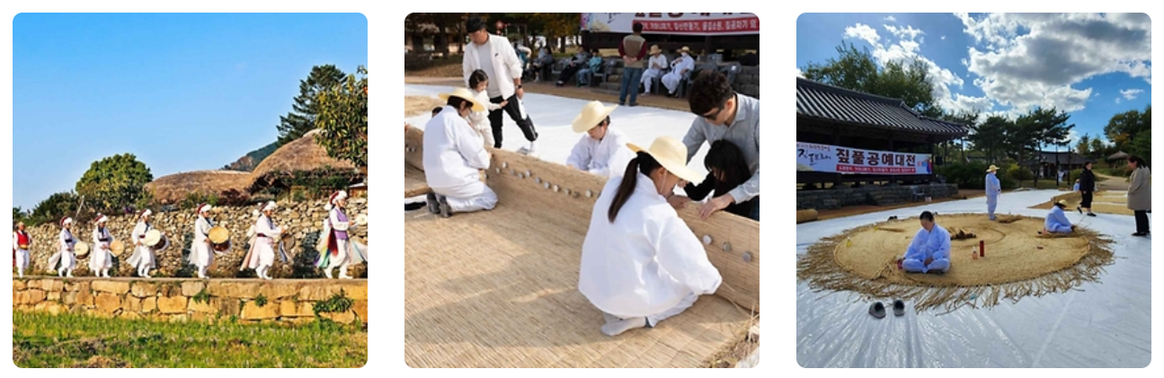 ✅ 짚풀문화제는 500년 역사를 간직한 살아있는 박물관인 외암민속마을의 가을 황금들녘에서 펼쳐지는 대표적인 농경문화축제다. 우리 조상의 슬기와 지혜를 엿볼 수 있는 짚풀을 활용한 다채로운 체험, 전시, 경연대회 등이 펼쳐지며, 축제 흥을 돋워줄 전국농악풍물페스티벌과 평소 들어가 볼 수 없었던 전통고택에서 가마솥밥해 먹기, 전통장 만들기, 전통주전부리 만들기 체험과 전통상여행렬, 초가이엉잇기 재현 등 점점 사라져 가는 민속문화를 배우고 체험할 수 있는 다채로운 행사가 펼쳐집니다.