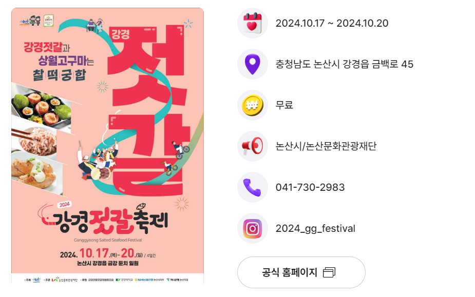 | 논산시 | 강경 젓갈축제 | 10.17.(목) ~ 10.20.(일) | 금강둔치 일원 |