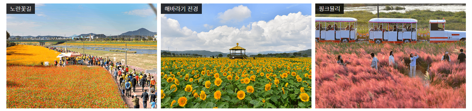 ✅ 매년 10월이면 황룡강 일대에 백일홍과 천일홍, 해바라기, 코스모스 등 100억 송이가 넘는 가을꽃이 만개하고, 대규모 테마 정원을 조성되어 많은 관광객들이 꽃강을 걸으며 아름다운 황룡강을 감상할 수 이는 화려한 볼거리를 자랑합니다.