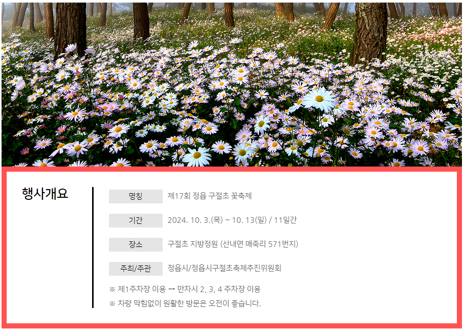 | 전북 정읍시 | 구절초 꽃축제 | 10.3.(목) ~ 10.13.(일) | 구절초 지방정원 |