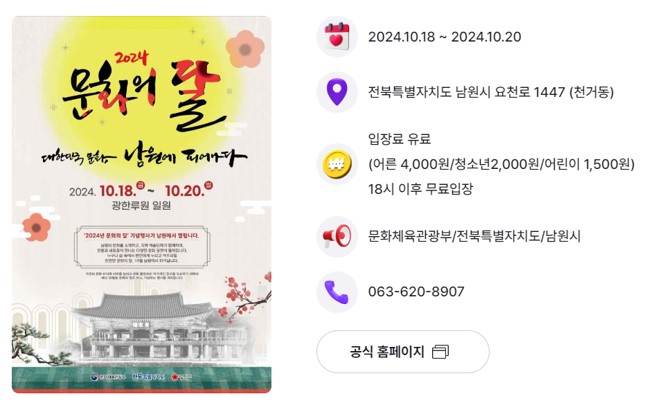 | 전북 남원시 | 문화의 달 | 10.18.(금) ~ 10.20.(일) | 광한루원 일원 |