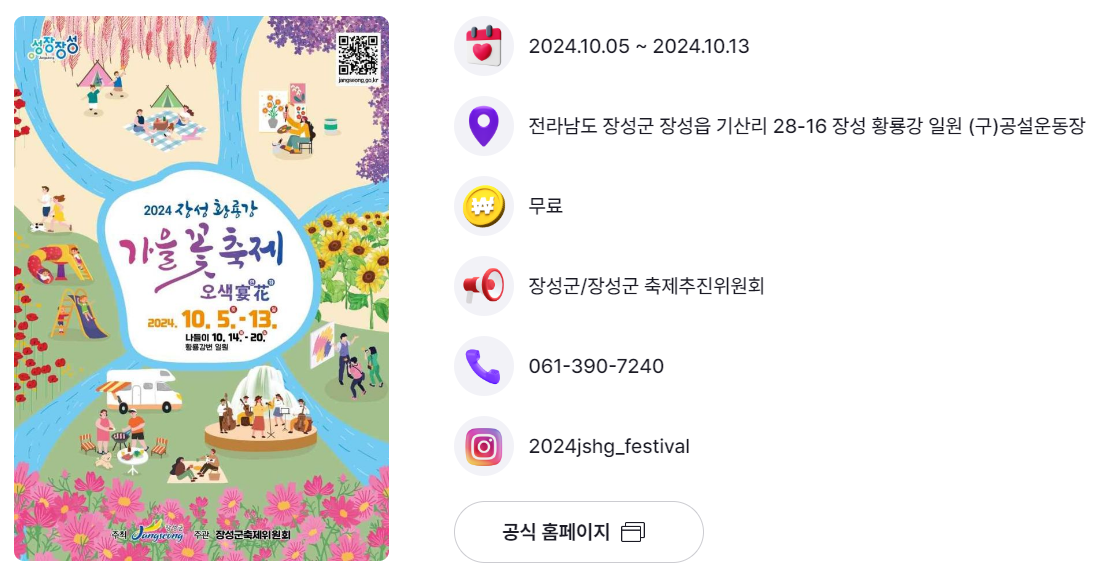 | 전남 장성군 | 황룡강 가을꽃축제 | 10.5.(토) ~ 10.13.(일) | 황룡강변 일원 |