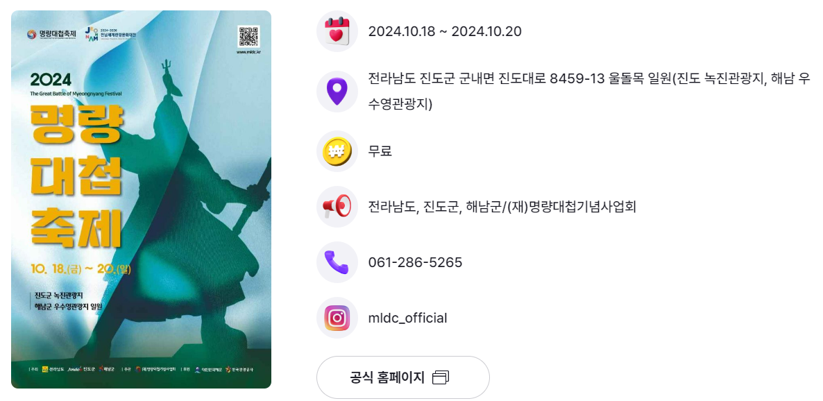 | 전남 진도군 | 명량대첩축제 | 10.18.(금) ~ 10.20.(일) | 해남군 우수영관광지 일원 |
