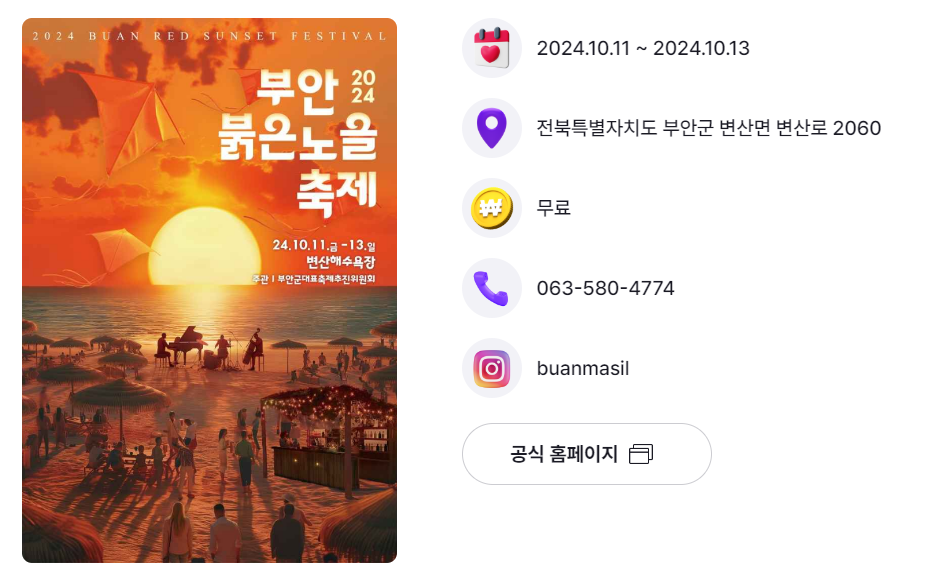 ✅ 서해에서 노을이 아름답기로 유명한 부안군 변산해수욕장에서 진행되며 붉은 노을과 함께하는 레드와인페스타, 재즈페스티벌, 부안 붉은 노을동요제, 카이트 카니발(대형 연)등 여러 연계행사로 다채로운 즐길거리로 구성됩니다.