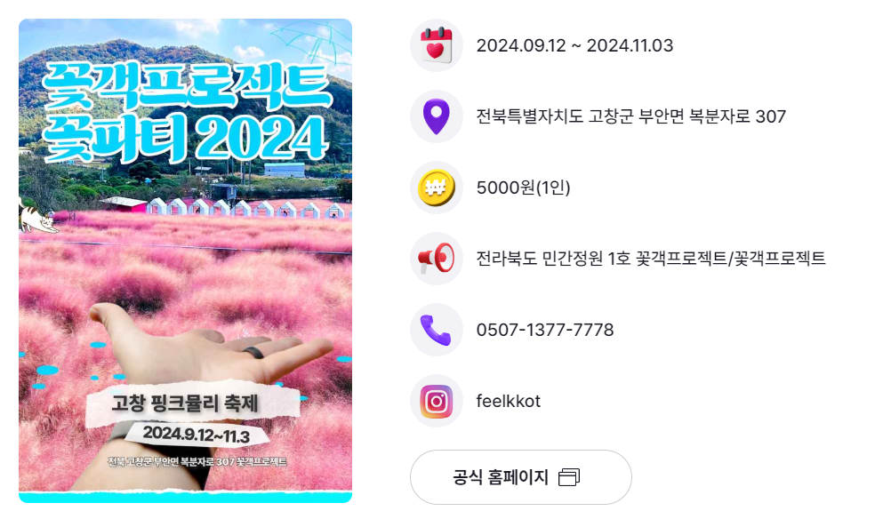 | 전북 고창군 | 핑크뮬리 축제 | 9.12.(목) ~ 11.3.(일) | 전북 민간정원 1호 꽃객프로젝트 |