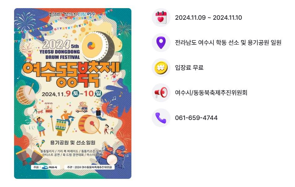 | 전남 여수시 | 여수 동동북축제 | 11.9.(토) ~ 11.10.(일) | 선소 및 용기공원 |