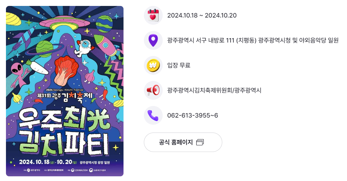 | 광주 서구 | 광주 김치축제 | 10.18.(금) ~ 10.20.(일) | 광주시청광장 일원 |