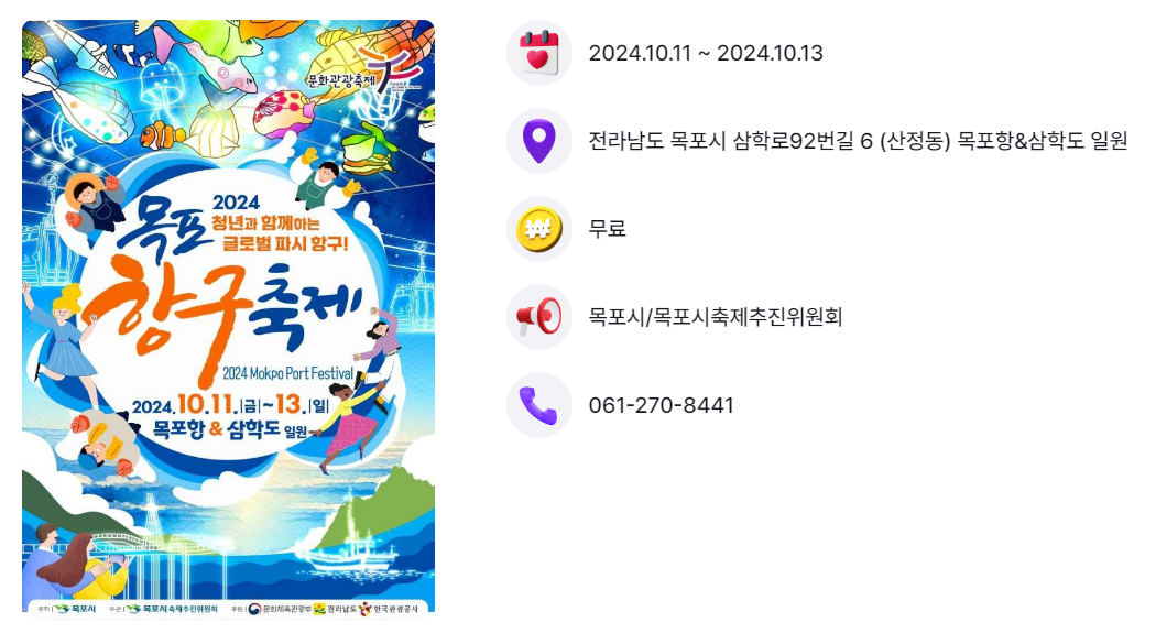 | 전남 목포시 | 목포 항구축제 | 10.11.(금) ~ 10.13.(일) | 목포함&삼학도 일원 |