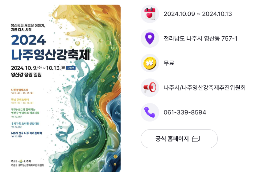 | 전남 나주시 | 나주 영산강축제 | 10.9.(수) ~ 10.13.(일) | 영산강정원 일대 |