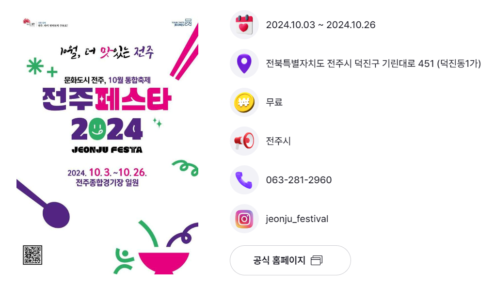 | 전북 전주시 | 전주페스타 2024 | 10.3.(목) ~ 10.26.(토) | 전주종합경기장 일원 |