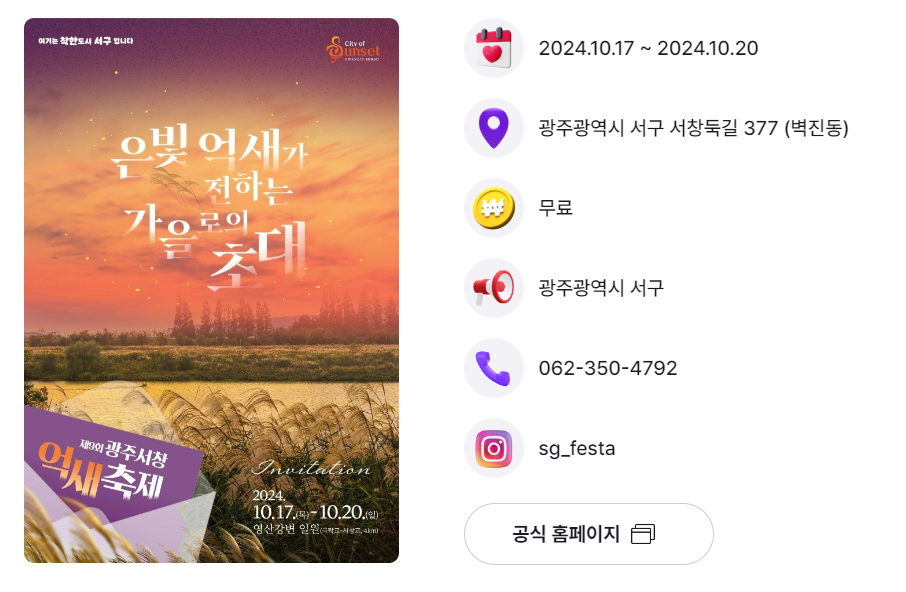 | 광주 서구 | 서창 억새축제 | 10.17.(목) ~ 10.20.(일) | 광주 영산강변 일원 |