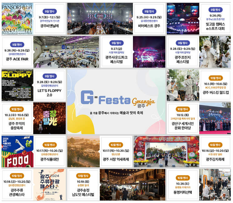 | 광주광역시 | G-광주페스타 | 9.25.(수) ~ 10.26.(토) | 광주광역시 일원 전북 김제시 |