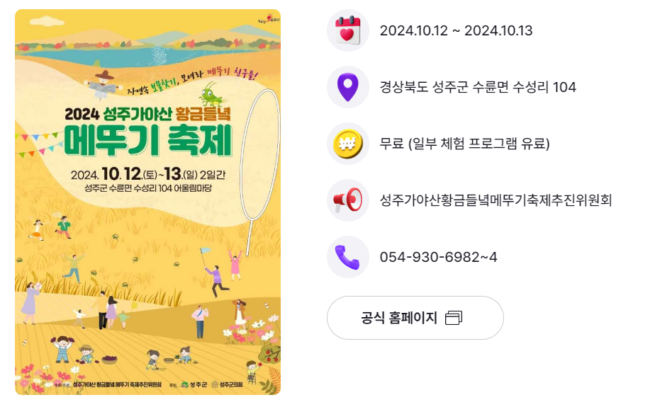 | 경북 성주군 | 황금들녘메뚜기축제 | 10.12.(토) ~ 10.13.(일) | 서륜면 수성리 104 |