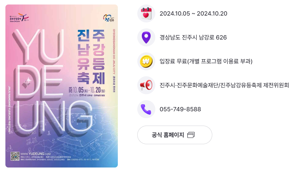 | 경남 진주시 | 남강 유등축제 | 10.5.(토) ~ 10.20.(일) | 진주성, 진주남강 일원 |