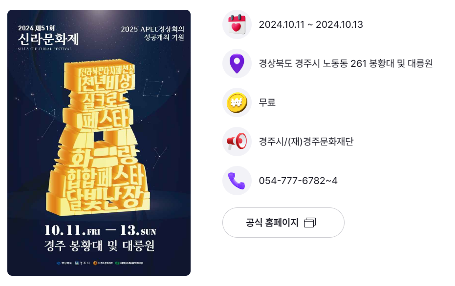 | 경북 경주시 | 신라문화제 | 10.11.(금) ~ 10.13.(일) | 경주 봉황대 및 대릉원 |
