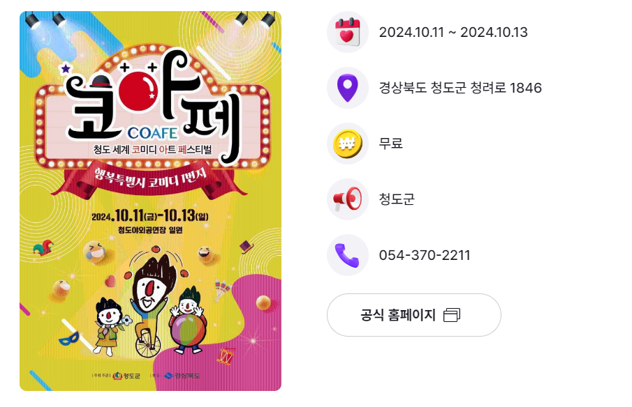 | 경북 청도군 | 세계 코미디아트페스티벌 | 10.11.(금) ~ 10.13.(일) | 청도야외공연장 |