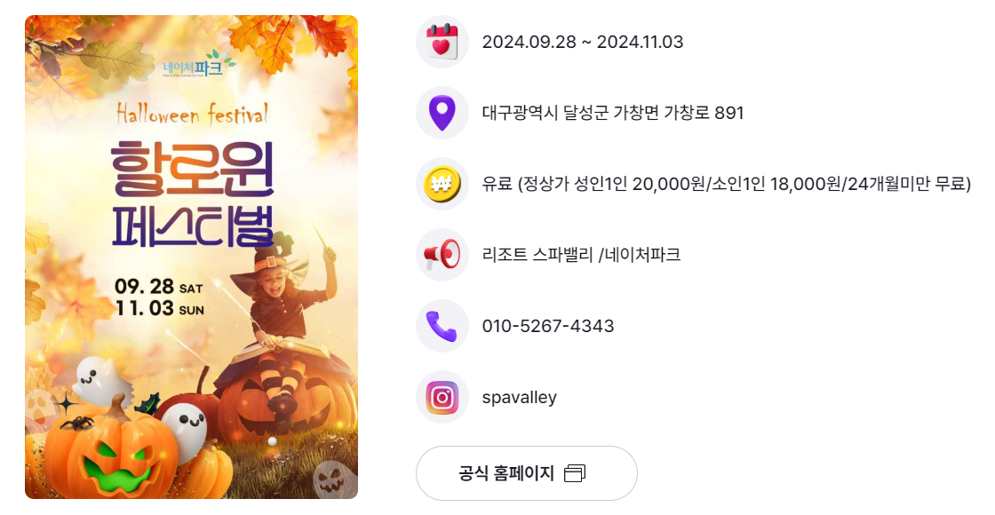 | 대구 | 할로윈 페스티벌 | 9.28.(토) ~ 11.3.(일) | 리조트 스바밸리, 네이처파크 |