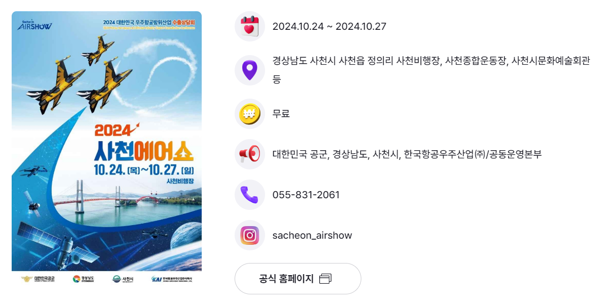 | 경남 사천시 | 사천에어쇼 | 10.24.(목) ~ 10.27.(일) | 사천비행장 |