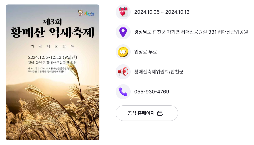 | 경남 합천군 | 황매산 억새축제 | 10.5.(토) ~ 10.13.(토) | 황매산군립공원 일원 |