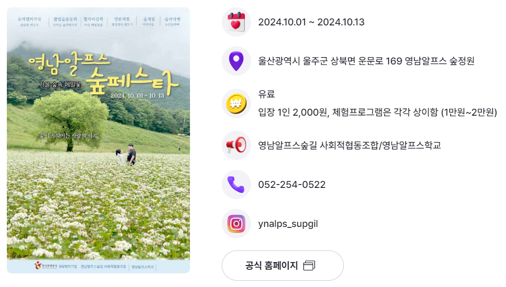 | 울산 울주군 | 영남알프스 숲페스타 | 10.1.(화) ~ 10.13.(일) | 영남 알프스 숲길 |