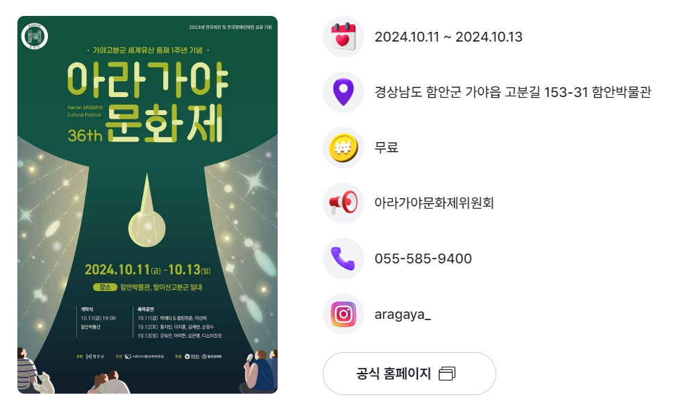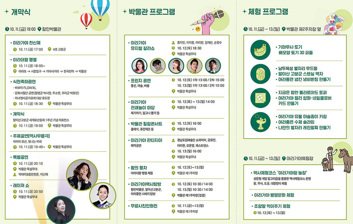 | 경남 함안군 | 아라가야 문화제 | 10.11.(금) ~ 10.13.(일) | 함안박물관, 말이산고분군 일원 |