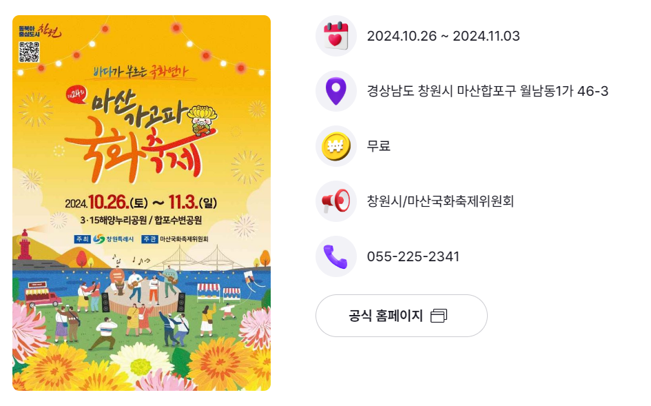 | 경남 창원시 | 마산 가고파국화축제 | 10.26.(토) ~ 11.3.(일) | 3.15 해양누리공원 및 합포수변공원 |