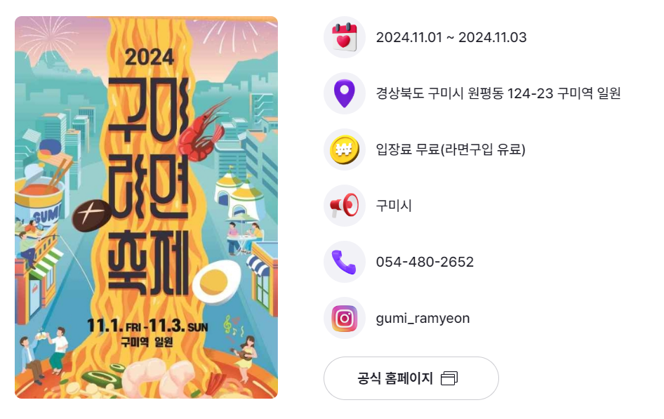 | 경북 구미시 | 구미 라면축제 | 11.1.(금) ~ 11.3.(일) | 구미역 일원 |