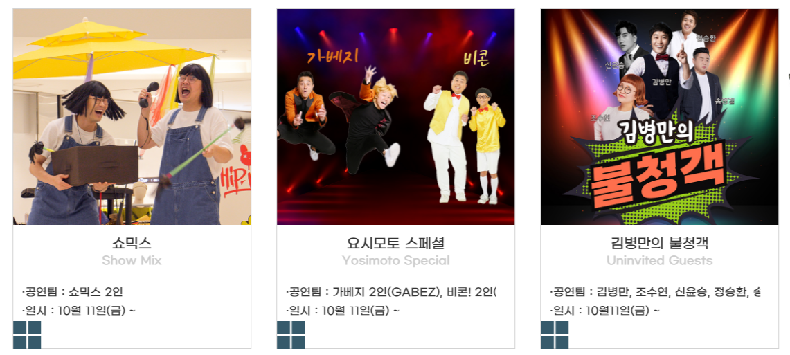 ✅ 야외공연장과 상설무대에는 해외초청공연으로 일본 최대 코미디 엔터테인먼트 요시모토 스페셜 무대와 국내초청공연으로 코믹 마임극 ‘삑삑이’, 세상 신기한 쇼를 다 보여주는 ‘SHOW MIX’, 벌룬 퍼포먼스 ‘매직유랑단’이 관람객들을 찾아갑니다. 실내극장에는 ‘김민형의 Fun한 매직쇼’, ‘김민기·홍윤화의 투깝쇼’가 관람객들에게 웃음과 즐거움을 선사할 예정입니다.
