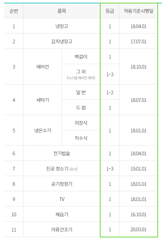 ✅ 아래의 11개 품목 중 <에너지 소비효율 등급>과 < 적용기준 시행일> 두 가지 모두 충족하는 가전제품만 환급 대상입니다.