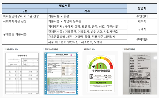 ▶ 주민등록등본상 가구원만 신청이 가능하며, 가구원이 신청하는 경우 주민등록등본을 첨부해야 합니다. 가구원 신청 방법 : 고효율가전 홈페이지 - 사업신청 - 사업신청 - 복지할인대상자 가구원 신청