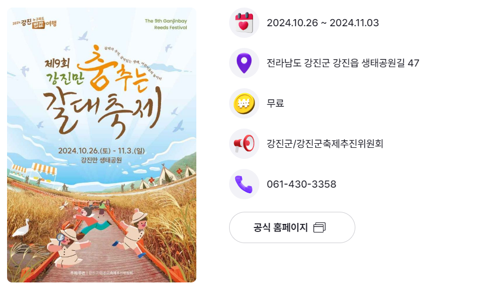 | 전남 강진군 | 강진만 춤추는갈대축제 | 10.26.(토) ~ 11.3.(일) | 강진만 생태공원 |