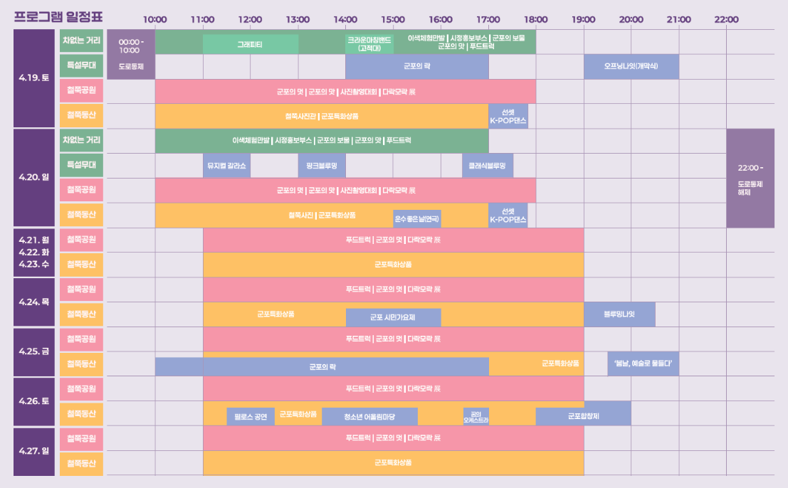 📌 장소: 군포 철쭉동산과 철쭉공원, 차 없는 거리에서 개최됩니다.