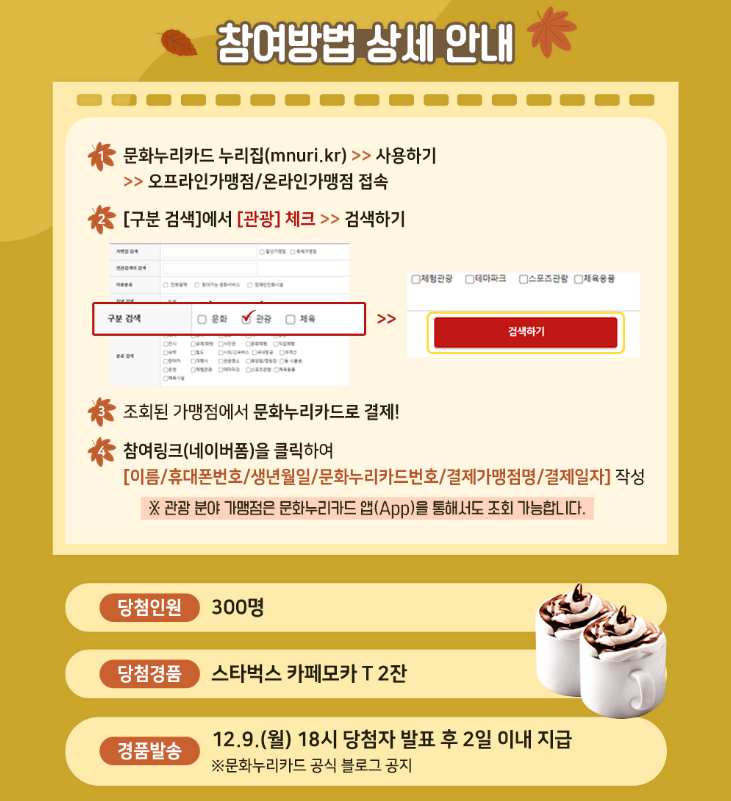 여행 가는 달이란 문화체육관광부와 한국관광공사가 국내 여행소비 촉진을 위해 추진하는 대국민 관광 활성화 캠페인입니다. 2024년 여행 가는 달 11월 중 문화누리카드로 관광 분야 결제 후 이벤트에 응모하면 추첨을 통해 스타벅스 카페모카 2잔을 증정합니다. 문화누리카드로 여행도 즐기고 스타벅스 커피도 받아가세요~!!