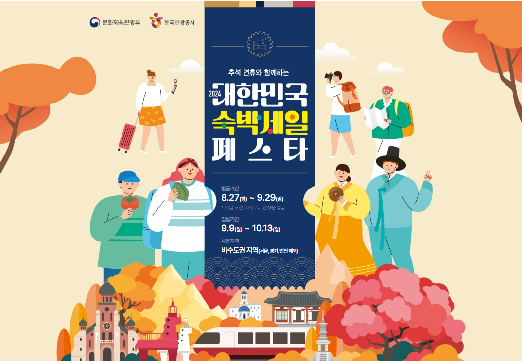 처서매직이라는 말을 실감할 정도로 아침저녁 날씨가 선선해지고 있습니다. 늦은 여름휴가나 9월 추석 연휴, 10월 개천절, 한글날 공휴일에 가을여행을 계획하고 계신 분들 많으시죠? 문화체육관광부와 한국관광공사는 전 국민을 대상으로 최대 3만 원 숙박 할인권 20만 장을 배포합니다. 준비된 쿠폰 수량이 소진되면 조기 마감되니 서둘러 3만원의 혜택 챙겨서 가을 여행 예약하세요~!!
