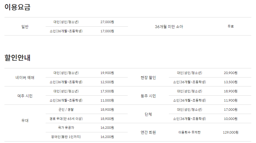 여주 시민, 동주 시민, 우대, 단체할인의 경우 매표소 현장 결제 시에만 할인이 적용