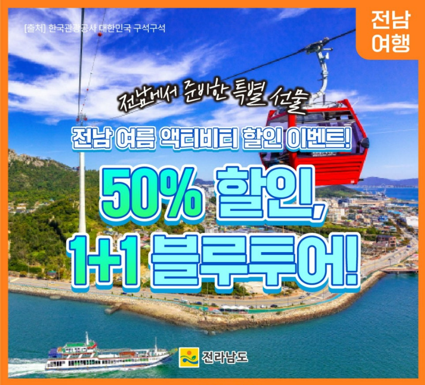 ✅ 전라남도 인기 관광 체험상품을 정가 대비 50% 할인된 가격으로 이용할 수 있는 1+1 블루투어 특별행사입니다.